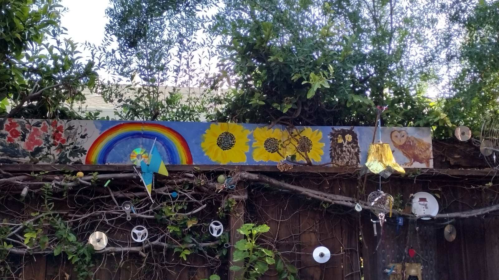 The big event this month was the painting of a little mural for them. The story of the project is very typical for my Dad - there was a part of the patio border that was falling apart and when he decided to fix it, it fell with dramatic results. So after a few foraging expeditions on the streets where stuff with the "free" signs could be obtained Dad fixed the fence somehow. However, the new part was white and looked odd and boring. And a request was placed to paint something on it. When we showed up with paints my parents art-directed the whole thing - Dad was explaining the concept and Mom was encouraging us to stop early and "not overwork it". There request was for typical Ukrainian flowers: Mallows and Sunflowers, a rainbow over Ukrainian flags and two owls.